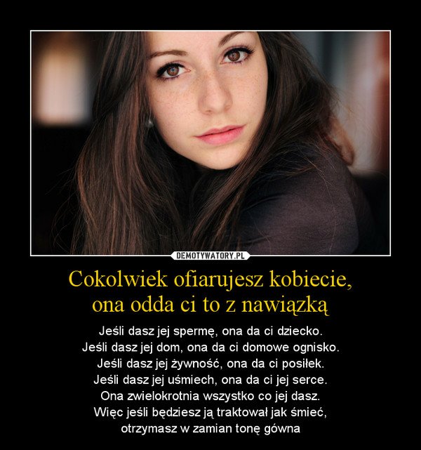 W końcu nie bez powodu to właśnie wybraliście tę kobietę za żonę, przypomnijcie sobie, jak to było na pierwszych spotkaniach, na pierwszej randce (o ile taka w ogóle była…) Gdy pierwszy raz poszliście z nią do łóżka. Wtedy popatrzcie na nią i pomyślcie jak się przez ten czas, przy was spędzony zmieniła- jeśli widzisz stara zgorzkniałą babę to pomyśl, że to właśnie Ty ja taka zrobiłeś, bo oddaje ci to, co Ty jej dałeś..